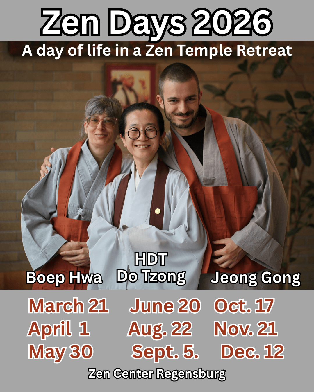 Der Zen-Tag auf Zen Center Regensburg ist eine wunderbare Gelegenheit, in einem kurzen Retreat eine einfache Einführung in die Praxis des Zen zu bekommen. Neulinge in unserer Gemeinschaft können unsere Zen Center Formen und unseren Stil mit einem erfahrenen Zen-Praktizierenden kennenlernen, der fünf der traditionellen 90-tägigen Retreats (“ango”) in den Bergen Koreas absolviert hat.
